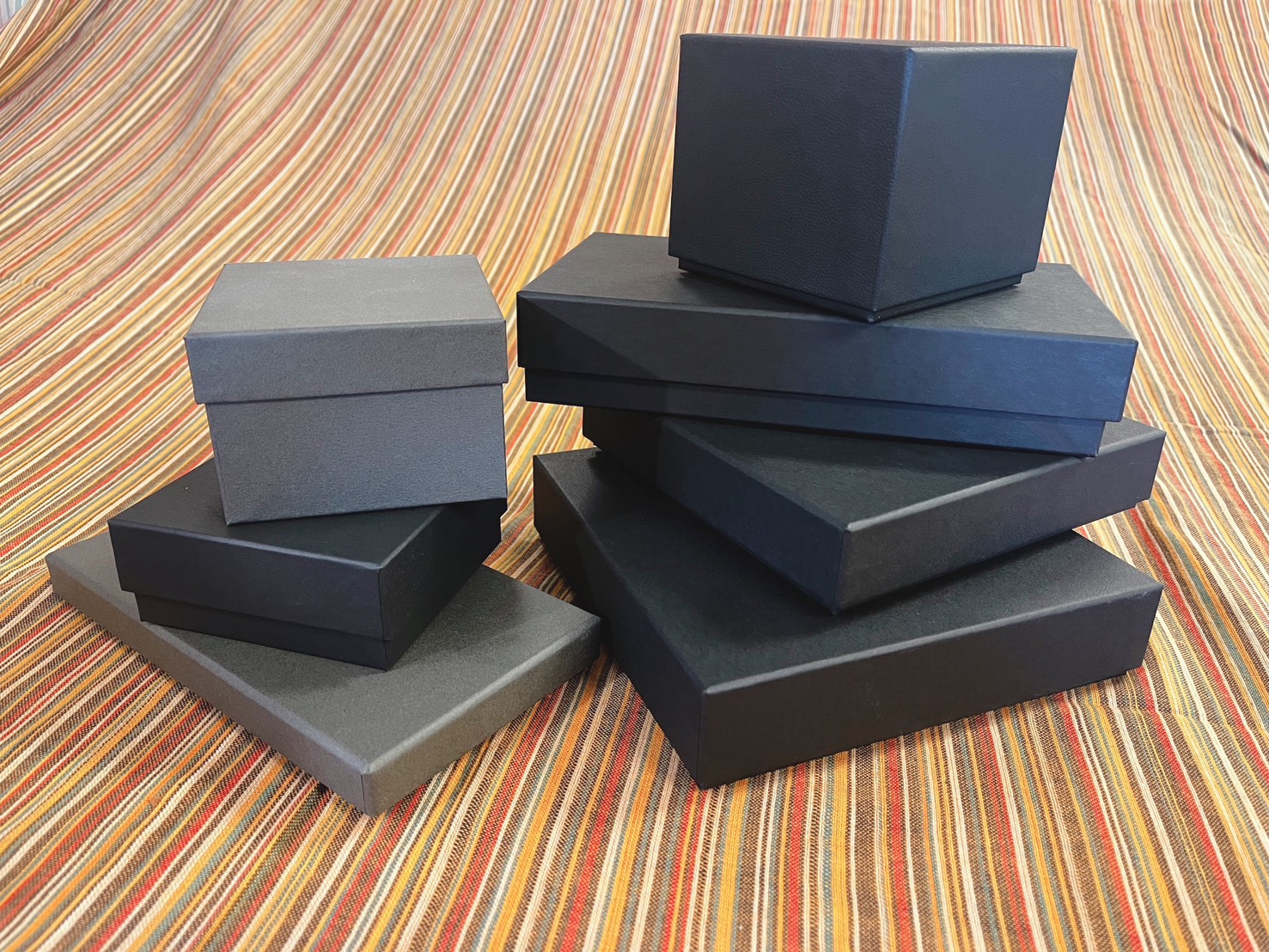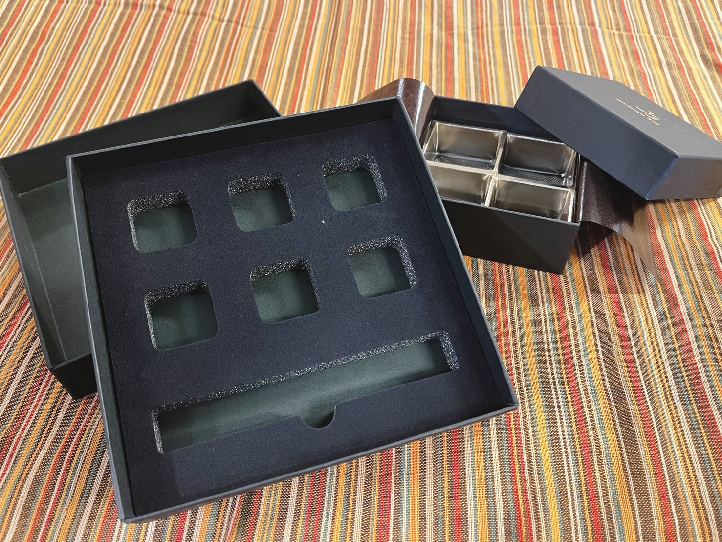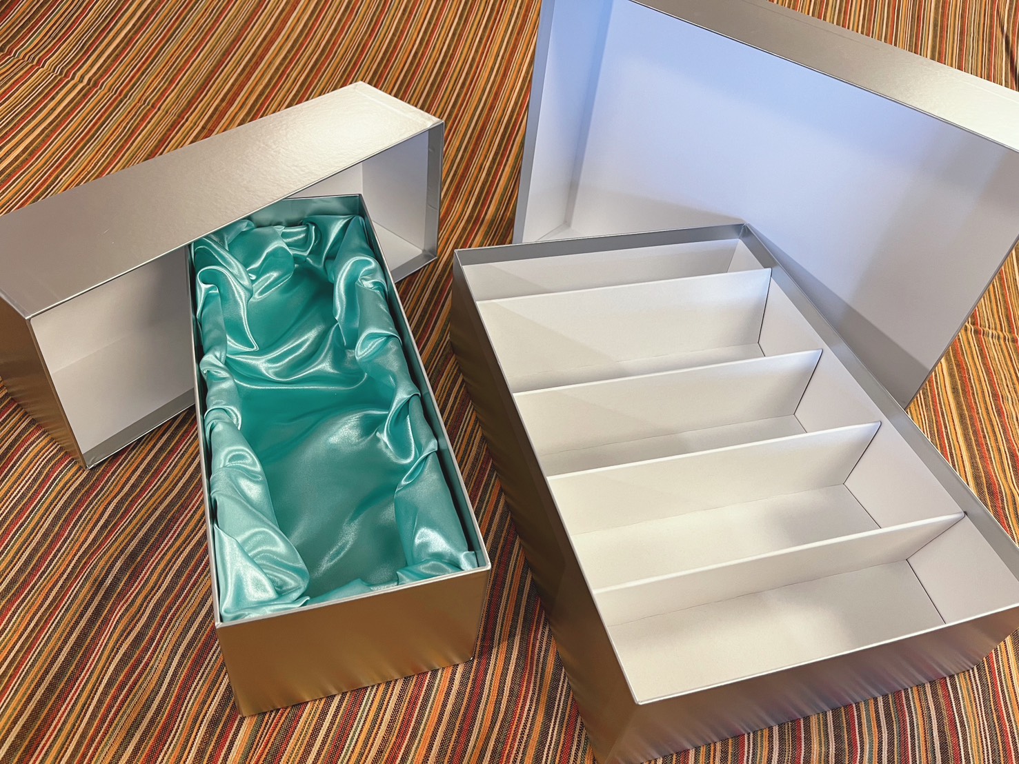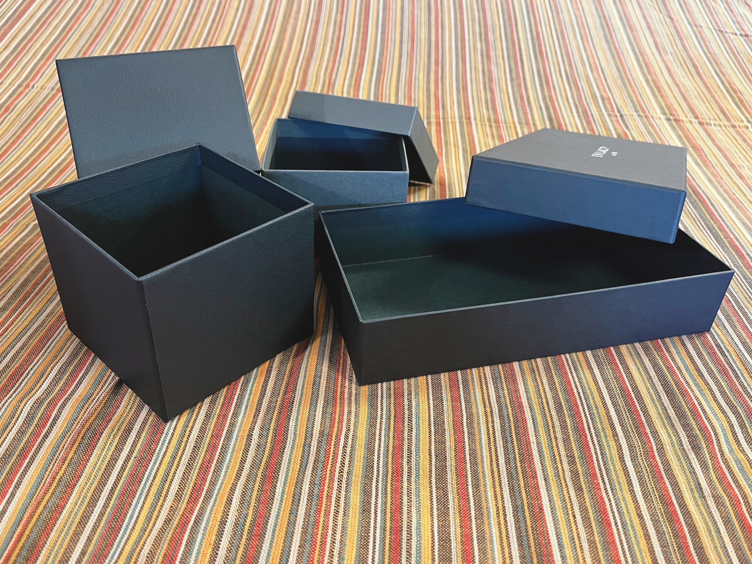 貼り箱はもともと折り目が見えにくく、表面がきれいに仕上がりやすい箱ですが、フタミ式はその良さが特に出しやすい形式です。フタと身が独立しているため、全体のバランスが取りやすく、シンプルでもそれなりに上品に見えます。過剰な演出をしなくても、箱としての完成度が出やすいのが長所です。