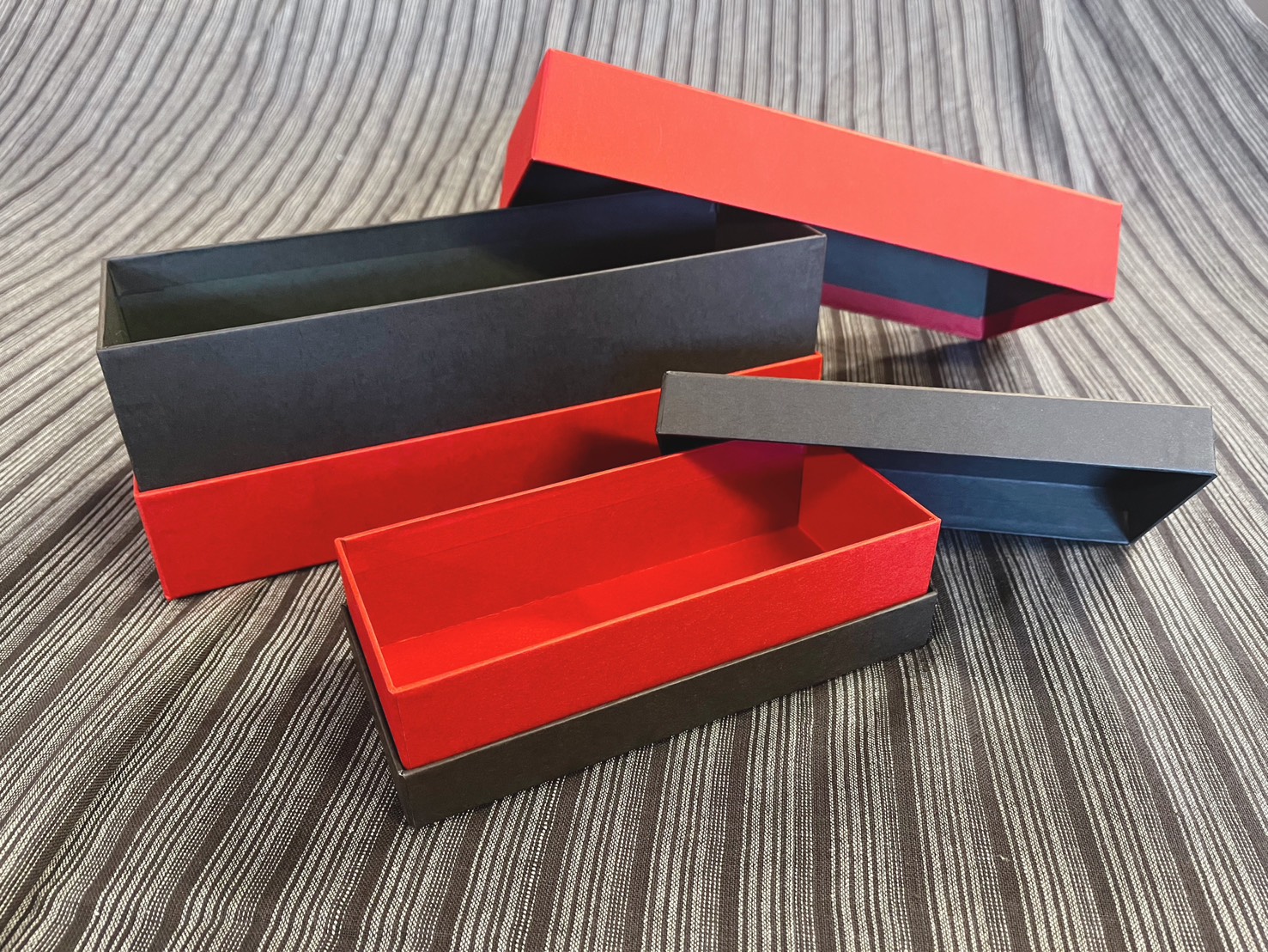 貼り箱のインロー式は、身箱の内側に中箱を設け、そこにフタをはめることで、閉じたときの見た目を整えやすくした形式です。長所は、高級感が出しやすいこと、開封時の印象を作りやすいこと、色使いで差を付けやすいことです。一方で、構造がやや複雑で、薄い商品には向きにくく、用途によっては少し重たい仕様になることもあります。箱を単なる容器としてではなく、商品の見せ方まで含めて考えるなら、インロー式はかなり有力な選択肢です。