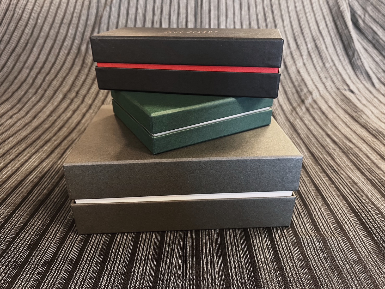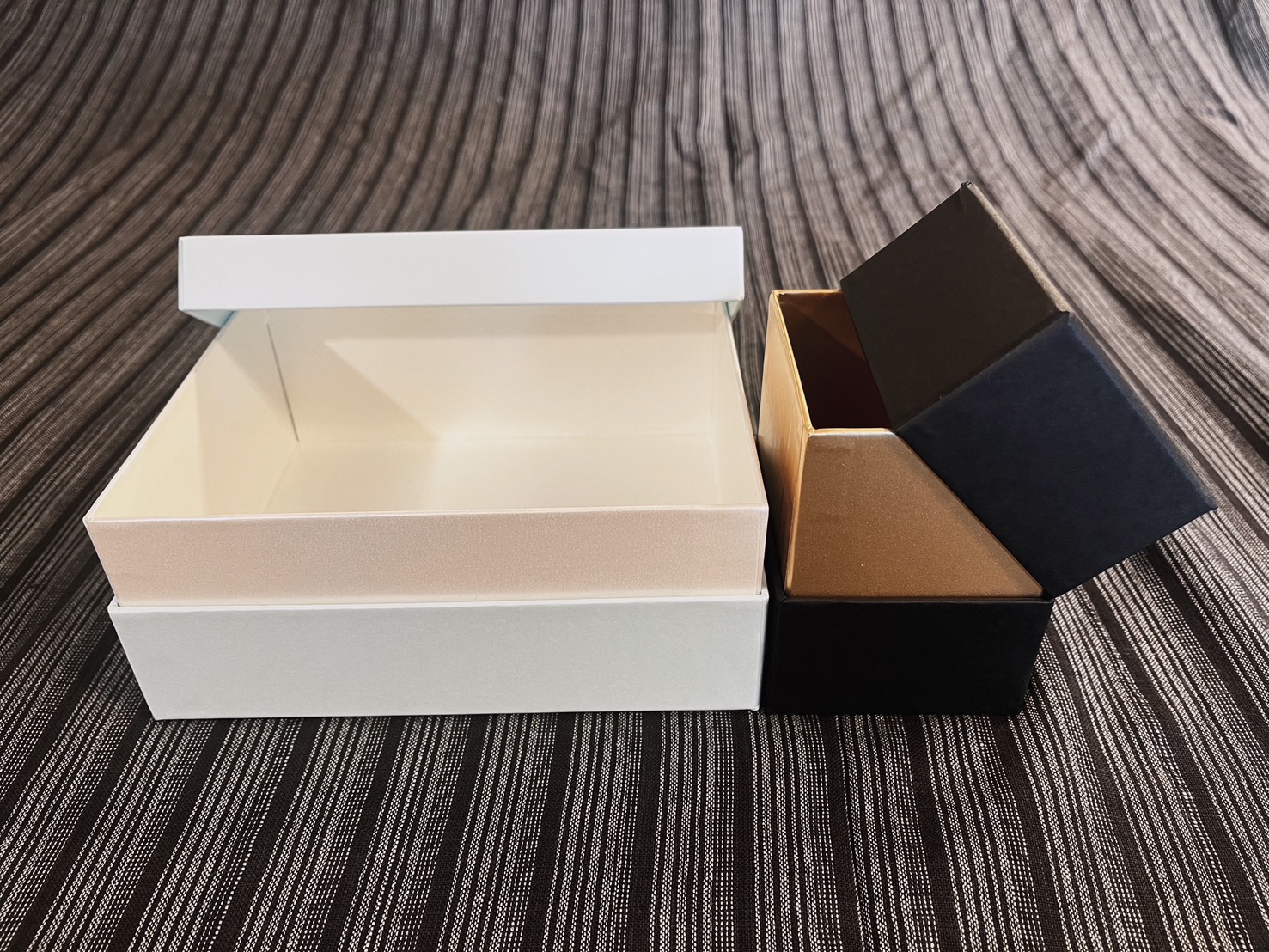 インロー式は、一般的なフタミ式のように「フタを上からかぶせる」印象よりも、箱の中央で上下が組み合わさる印象が強い形式です。閉じたときのラインが整いやすいため、貼り箱らしい厚みを持ちながら、外観は比較的シャープに見えます。見た目のきちんと感が出しやすいので、箱そのものを商品の一部として見せたいときに向いています。