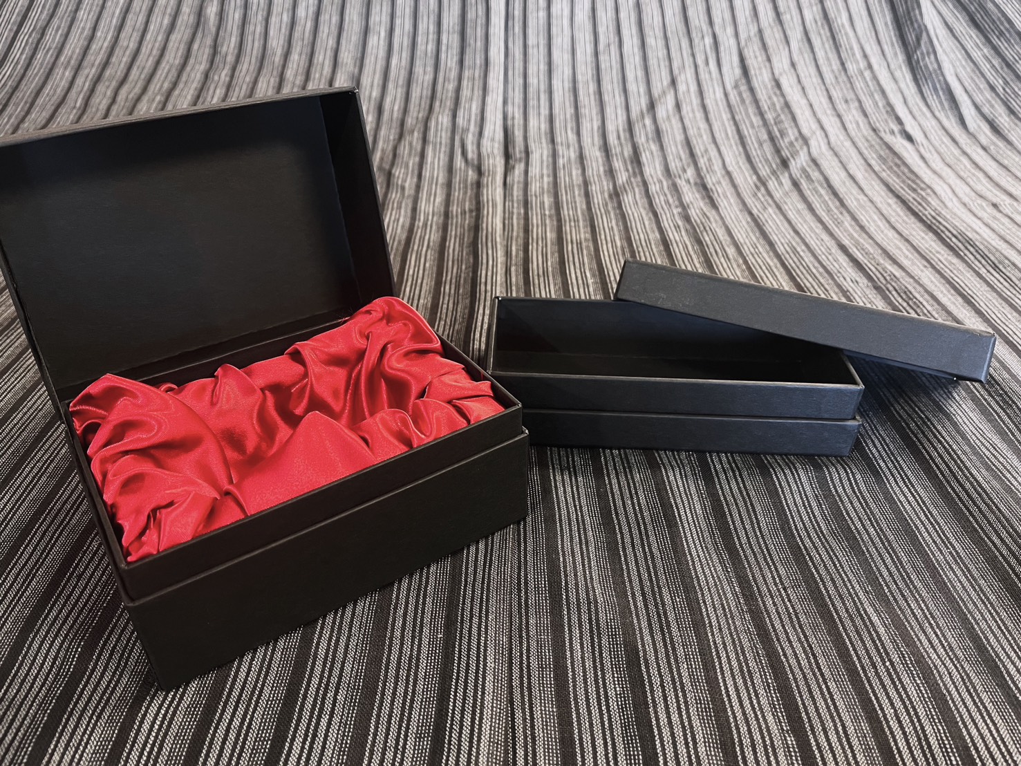用途としては、ギフト、化粧品、ジュエリー、記念品など、ある程度の高級感や特別感を持たせたい商品と相性が良いとされています。フタを開けたときに中身が見やすく、開封体験まで含めて印象を作りやすいことも、インロー式が選ばれる理由のひとつです。