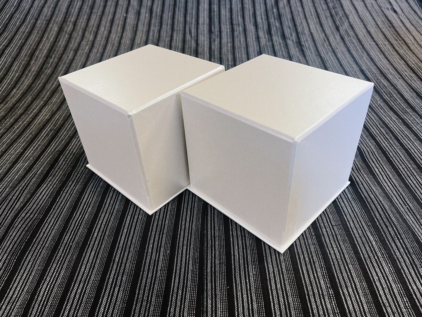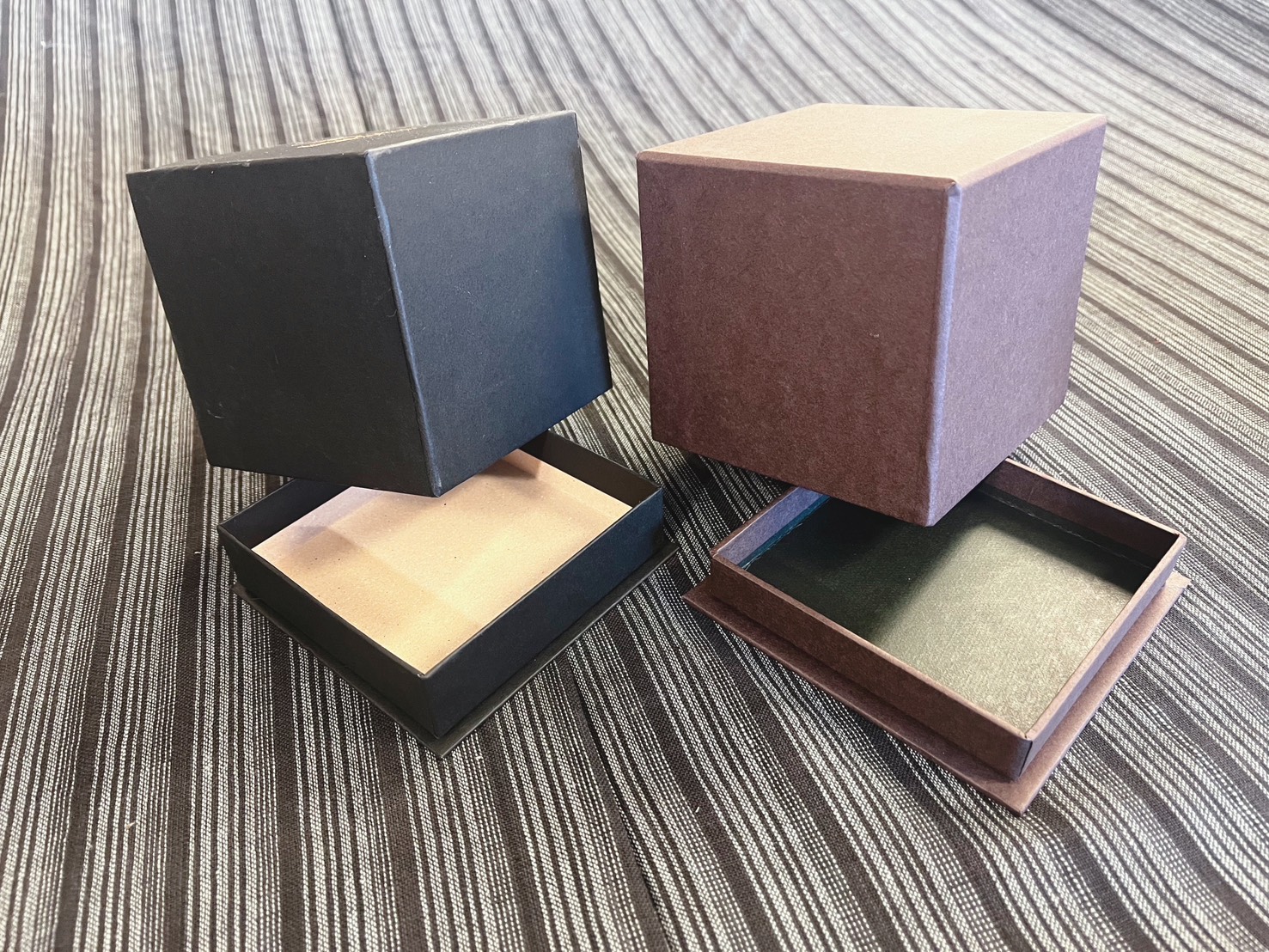 底台座式の長所は、まず見た目に特徴が出やすいことです。一般的なかぶせ式よりも構造の違いが外観に表れやすいため、箱だけで少し印象を変えたいときに使いやすい形式です。貼り箱はもともと丈夫で、質感のある紙や印刷紙を使い分けやすく、素材の見せ方にも向いています。底台座式にすると、その素材感や輪郭の違いがよりはっきり出ます。さらに、貼り箱は完成した立体の状態で納品されるため、組み立ての手間がなく、商品セット作業を進めやすいのも実務上の利点です。