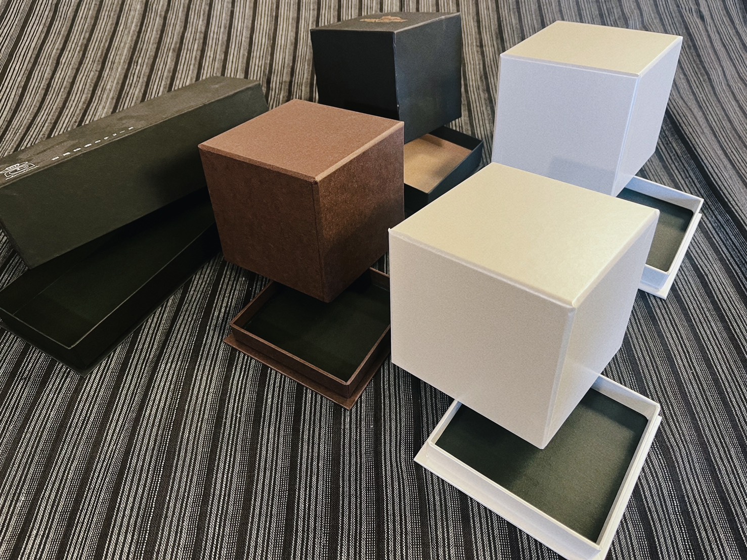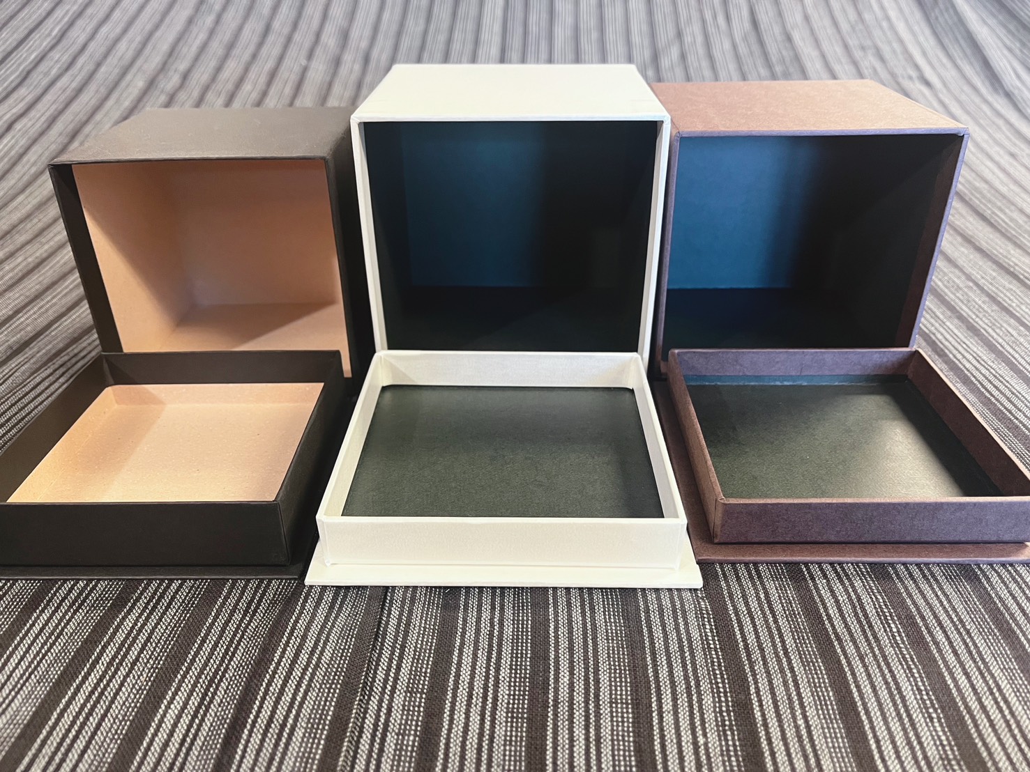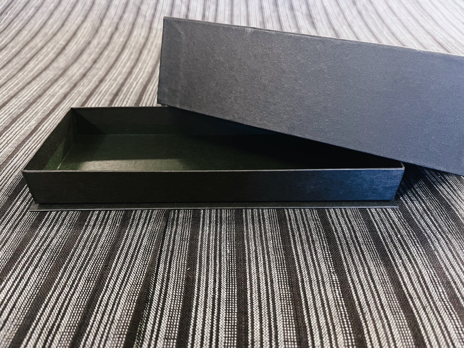 一方で、底台座式はシンプルなフタミ式より構造が一段増えるため、見た目の狙いが曖昧だと良さが出にくい形式でもあります。箱に個性は出ますが、用途によってはそこまで必要ないこともあります。また、貼り箱全体に言えることとして、組み立て式の紙箱に比べるとコストは上がりやすく、完成品の状態で納品されるため保管スペースも必要です。大量保管を前提にした案件や、とにかく価格を抑えたい案件では、別形式の方が合いやすい場合があります。