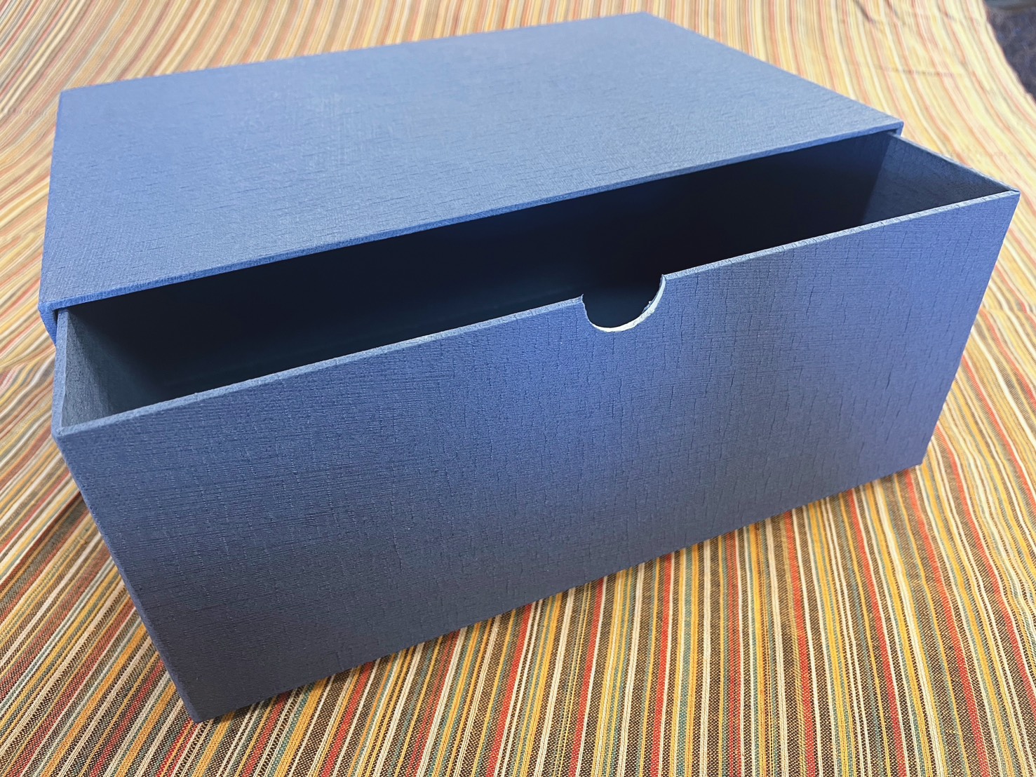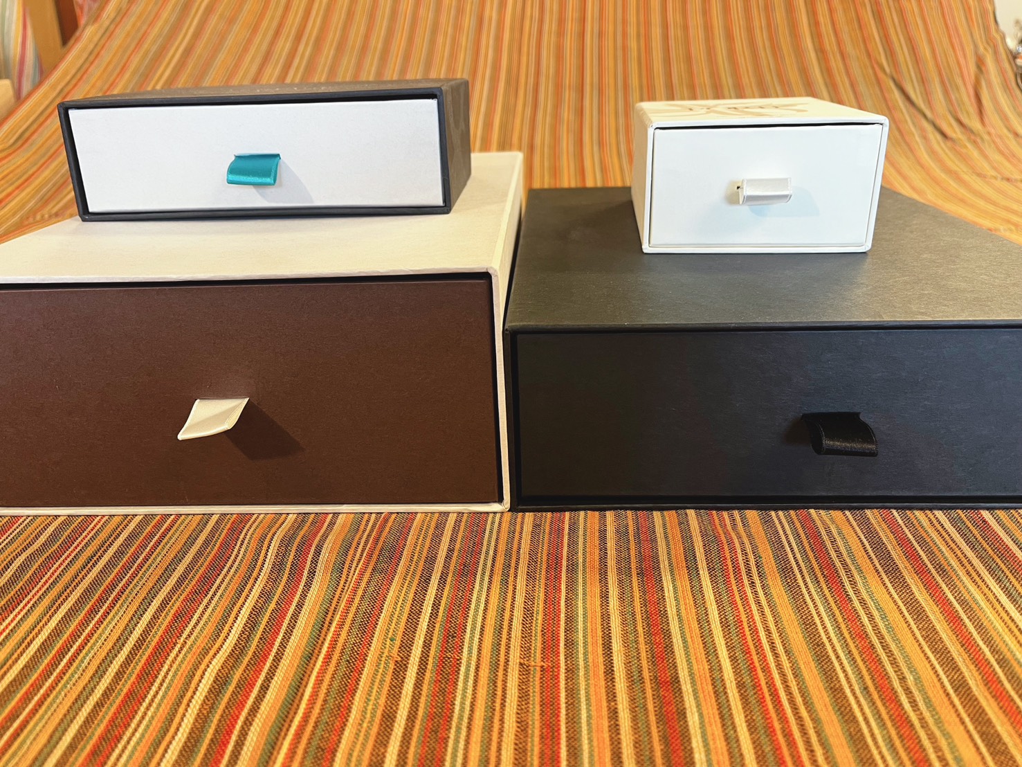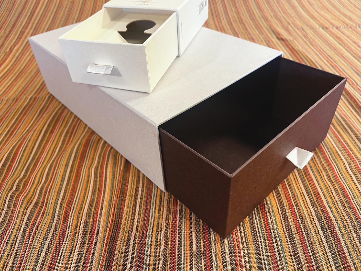 一方で、引き出し式は万能ではありません。まず、構造が増えるぶん、フタミ式のようなシンプルな形式より設計や加工が少し複雑になりやすく、持ち手のリボンや穴加工を加えると、その分だけ手間やコスト要素も増えます。見た目が良い反面、仕様を盛りすぎると価格は上がりやすい形式です。