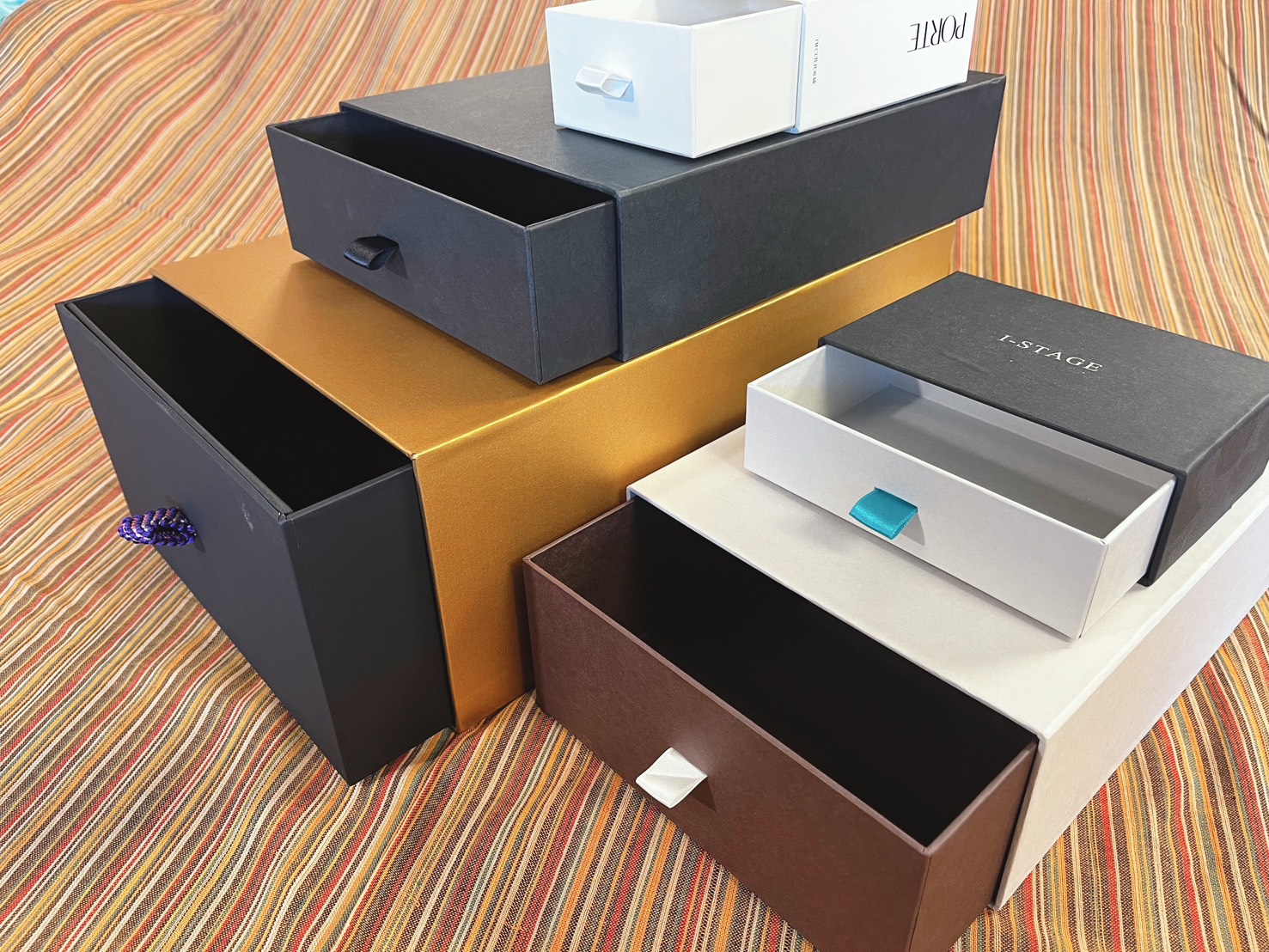 引き出し式のいちばんの特徴は、「中身が一気に全部見えない」ことです。少しずつ現れる見せ方になるため、開封時に期待感が出やすく、ギフトや高級感を重視する商品と相性が良い形式です。単に収納するための箱ではなく、開ける動作まで含めて印象を作れるところが、引き出し式の強みです。